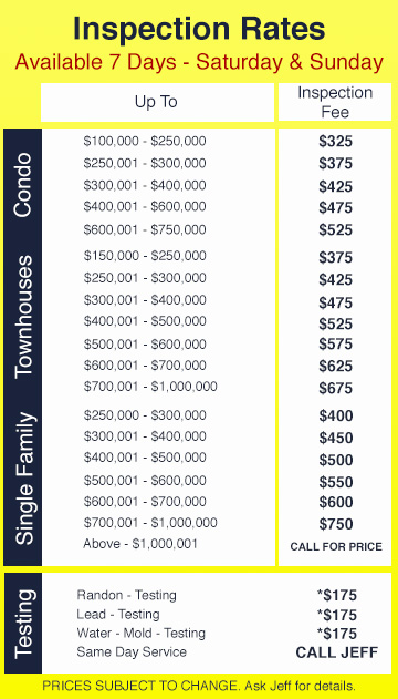 We are a full service home inspection business with over 25 years of hands on inspection experience, same day service 7 days a week 6:00 a.m. to 11:30 p.m. daily. Our rates are very reasonable & our prices have not changed for over 10 years. We service Maryland, Washington D.C., Virginia, Delaware. We are licensed and insured, we accept credit cards, checks, usps money orders & cash only. We also offer environmental testing including indoor air quality, mold, asbestos, soil, radon, water & lead testing. If you mention this ad you will receive $25.00 OFF any test. All test MUST be performed on the same day of home inspection. SERVING ALL OF MARYLAND, WASHINGTON D.C., NORTHERN VIRGINIA, DELAWARE. Contact us at 301-717-1454 Jeff or 301-717-2046 Anthony